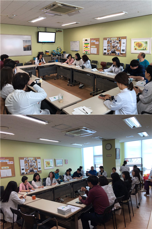 매월 전 직원이 모여 회의를 통해 이음병원의 철학을 공유하며 전 직원에게 병원운영에 대한 소식을 전달하고 각 부서 간 활동에 대해 알리며 직원간의 소통하는 시간을 가졌습니다.​​